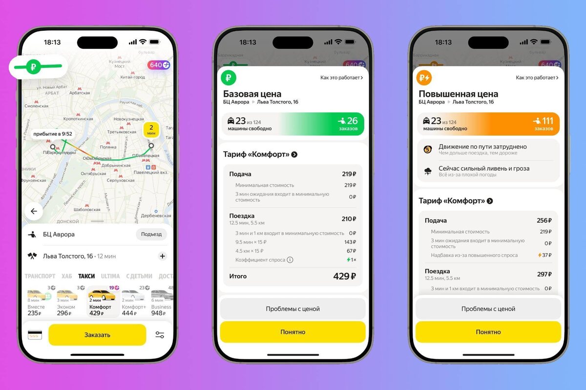 Видно, из чего формируется цена, сколько людей рядом хотят уехать и сколько машин свободно. Раздел доступен через иконку с рублем, а данные в нём обновляются каждую минуту и учитывают ситуацию в радиусе 2-3 км от точки подачи. Если на стоимость влияют пробки, погода или что-то ещё, это тоже покажут.