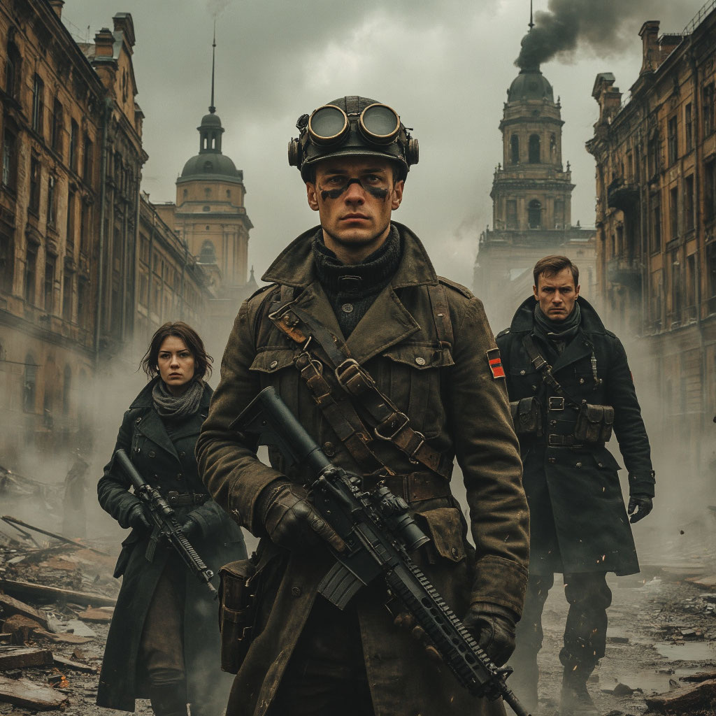 Они появились в заброшенном складе на окраине Петербурга. Вокруг — мир дизельпанка: дымящие дирижабли, паровые экипажи, уличные фонари на биогазе. Вдали возвышается башня Академии Хроноинженерии с вращающимися шестернями и громоотводами.