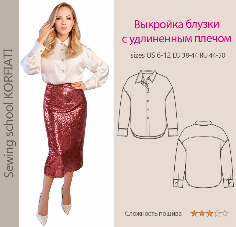 Стремительно приближаются праздники, и с каждым днем время все стремительнее ускоряет отсчет дней, часов и минут до наступления нового года. Но даже несмотря на предновогоднюю суету, бесконечный поиск подарков, закупок мишуры и деликатесов, не стоит забывать о том, что скоро начнутся новогодние корпоративы. А это значит, что пришло время задуматься о праздничном образе, который поможет вам создать прекрасное настроение и весело провести время в кругу сослуживцев. Эта блузка оттенка ivory сшита из тяжелого люксового шелка MaxMara. У модели современный свободный крой, что делает ее очень комфортной в носке. Торжественности блузке придают две вещи: акцентные металлические пуговицы, инкрустированные сияющими кристаллами, и ткань, которая за счет своей фактуры создает при движении непередаваемую игру света и тени. Если и существует роскошь, то она, бесспорно, воплощена в этой блузке! Готовая выкройка блузки с удлиненным плечом разработана на 44-50 стандартные размеры и скачать ее можно на с