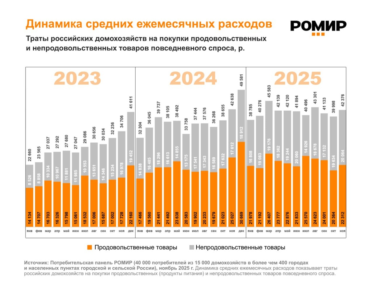 составили ежемесячные траты российских домохозяйств в ноябре 2025 года 🔸 Согласно данным Потребительской панели РОМИР, среднестатистическая российская семья в ноябре 2025 года потратила на продукты питания и товары повседневного спроса 42 376 р. 🔸 По сравнению с октябрем расходы выросли на 2 377 р. (+5,9%). Год к году траты незначительно сократились — на 263 р. (-0,6%). 🔸 Традиционно большую часть корзины составили траты на продовольственные товары: 22 312 р. (53% от общего объема расходов); траты на непродовольственные товары составили 20 064 р. (47%). «Традиционно в ноябре мы наблюдаем рост трат россиян, что связано с началом подготовки к новогоднему сезону. Однако текущая динамика среднемесячных расходов находится на уровне инфляции. Если рассматривать ситуацию в разрезе года, мы видим, что расходы россиян даже сократились по сравнению с прошлым ноябрем. Это говорит о стремлении домохозяйств рационализировать свою корзину в целях оптимизации затрат. При этом в абсолютном выра