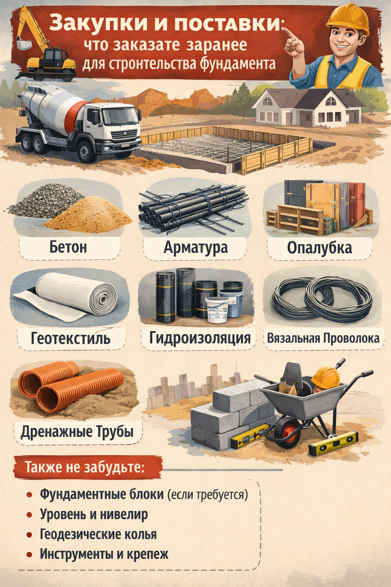🚛 Закупки и поставки: что заказать заранее для строительства фундамента