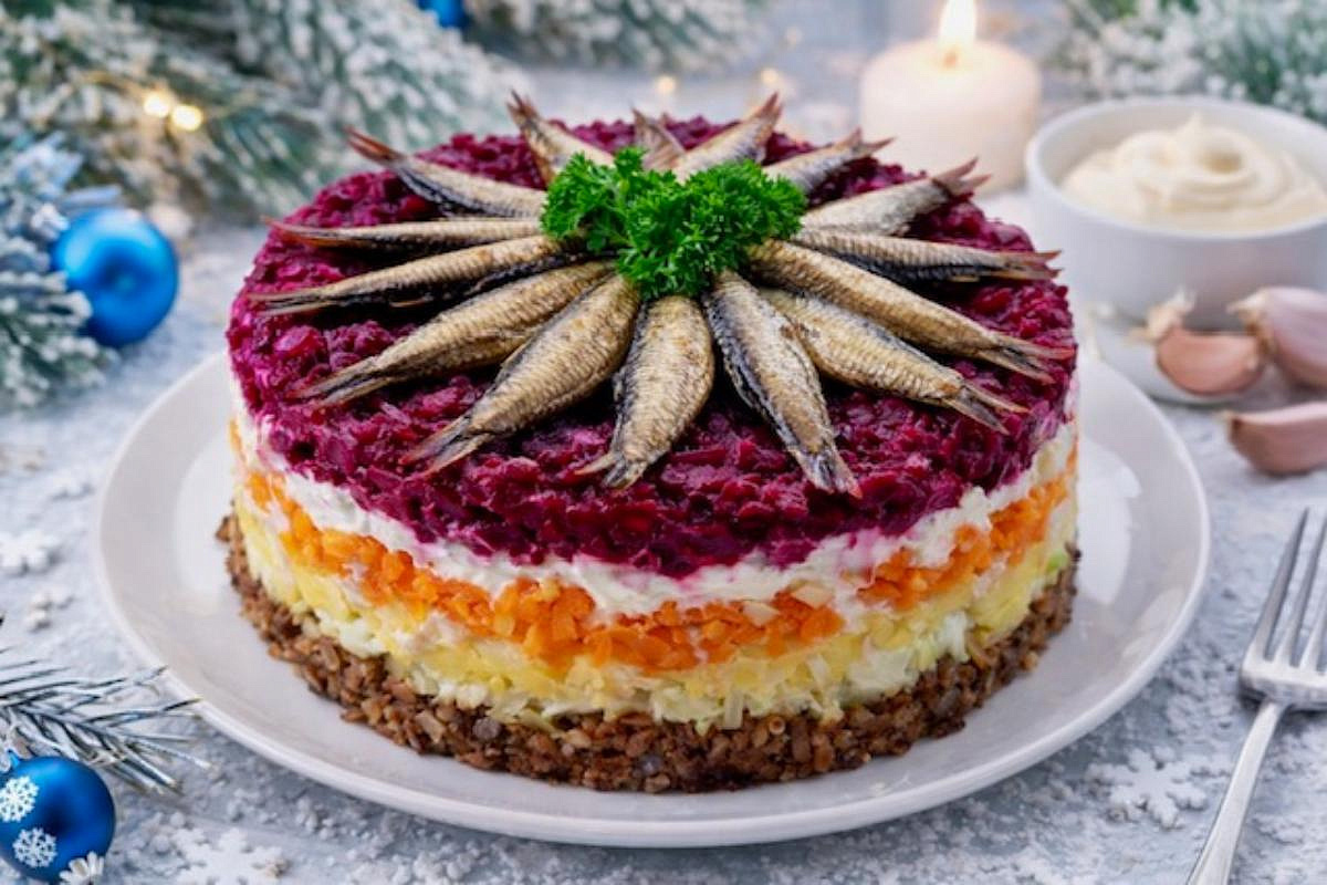 со шпротами и свёклой решает эту задачу: он сохраняет слоёность и уют, добавляя копчёную ноту и мягкую сладость корнеплодов.
