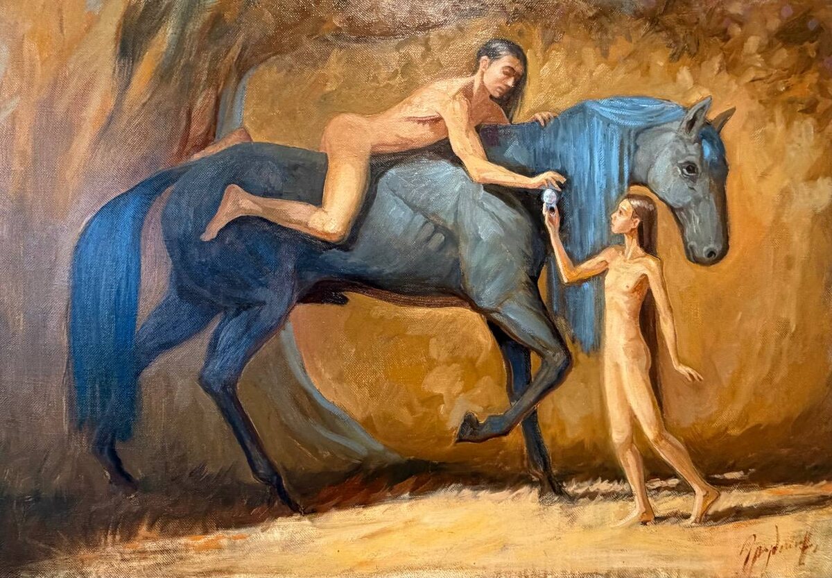 65х95 холст/масло 2025 ••• Степан Грудинин в картине «Плод познания» соединяет театральность, живописность и пластическую ясность. Его персонажи напоминают фигуры раннего Ренессанса, но оказываются существами почти вне времени. Конь, человек, жест передачи «плода» — всё собрано в динамичную композицию, где узнается опыт мультипликации. Здесь нет буквальной цитаты, но есть то, что для художников XV века было важнее всего: интерес к человеку и к тому моменту, когда он делает выбор. ••• Отдать дань почтения средневековому кватроченто, можно на выставке «Реверанс эпохе Возрождения» до 10 января 2026. ••• Москва, Ходынский бульвар 20а, с 11:00 до 21:00 ежедневно. Выставка бесплатная, работы продаются. Вся контактная информация на сайте YOLKA.art