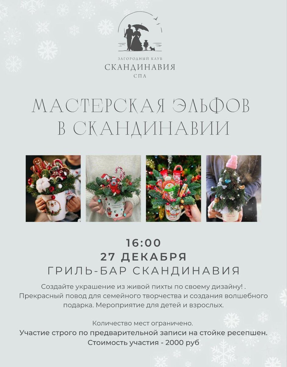 активности без анимационного шума. 27 декабря в гриль-баре «Скандинавия» пройдёт мастерская эльфов: камерный мастер-класс по созданию новогодних композиций из живой пихты. Формат простой и тёплый — работа руками, живые материалы, индивидуальный дизайн, который можно унести с собой как готовый подарок или домашний декор. Хороший пример того, как отельный F&B и событийка работают не ради галочки, а ради атмосферы. Небольшое мероприятие, понятный тайминг, семейная аудитория — и ещё один повод провести декабрьский день не в торговом центре, а за городом, в нормальном ритме. #скандинавия