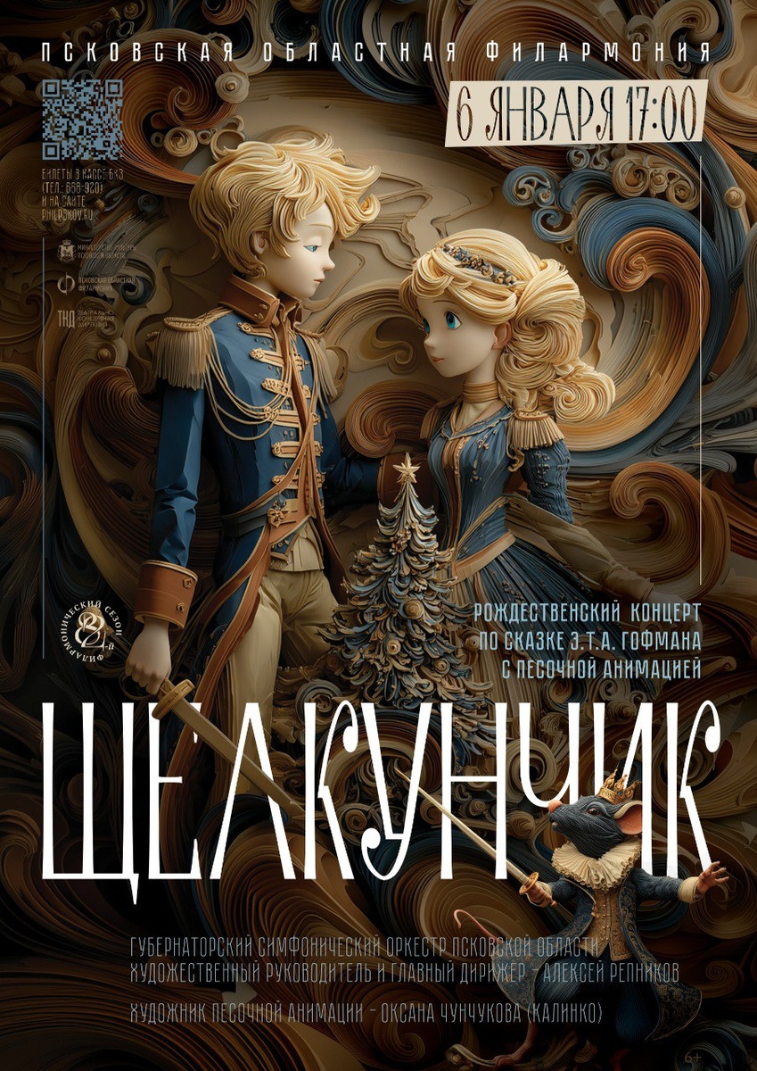 »! 🎅🏼 Погрузитесь в удивительный мир сказки, созданной гениальным Э.Т.А. Гофманом, и насладитесь вечной музыкой Петра Ильича Чайковского, ставшей символом каждого Нового года. Герои повести оживут прямо на ваших глазах благодаря уникальному мастерству песочной анимации Оксаны Чунчуковой, а величественная музыка прозвучит в исполнении Губернаторского симфонического оркестра Псковской области под управлением Алексея Репникова. ⭐ 6 января в 17:00‼ Скорее покупайте билеты и встречайте праздник особенным образом! 🎶 https://philpskov.ru/afisha/koncert_schelkunchik_06_01_2026_17_00