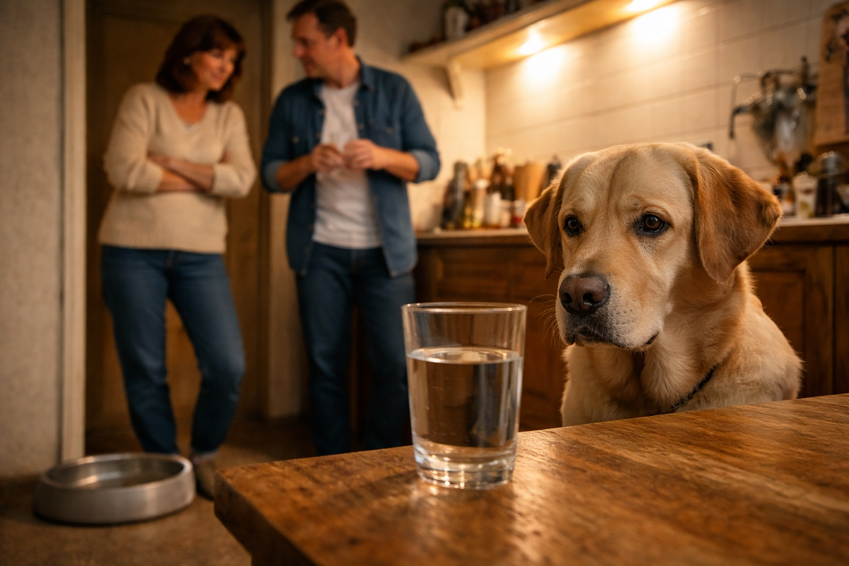 Сергей взял стакан, поставил на край стола пониже, чтобы Гром достал. Гром подошёл, аккуратно положил передние лапы на табурет, вытянул шею и начал пить. Медленно. Вдумчиво. С чувством. Как сомелье, которого попросили оценить “водичку 2023 года, урожай хороший”.