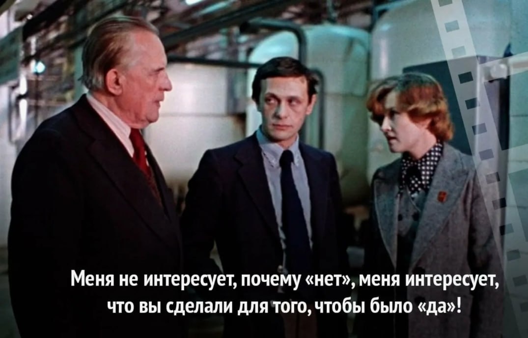 Из фильма «Москва слезам не верит». Что в ней кажется правильным: - смещает акцент с оправданий на действия, - звучит как требование ответственности, - нейтрализует оправдание “почему не получилось” фразой "могу Вам рассказать о своих трудностях". К применению не рекомендую. Потому что эта фраза - чтобы заглушить. Вместо анализа она создаёт страх. Сотрудник будет прятать правду, чтобы не попасть под “недовольство”. Он будет играть в “да”, добавляя в "историю" то, что проверить невозможно. 📍 Фраза яркая. Она выражает жёсткость, но разрушает обратную связь. Для фильма подходит, но не для работы. Потому что от таких фраз проблемы не уходят — они прячутся.