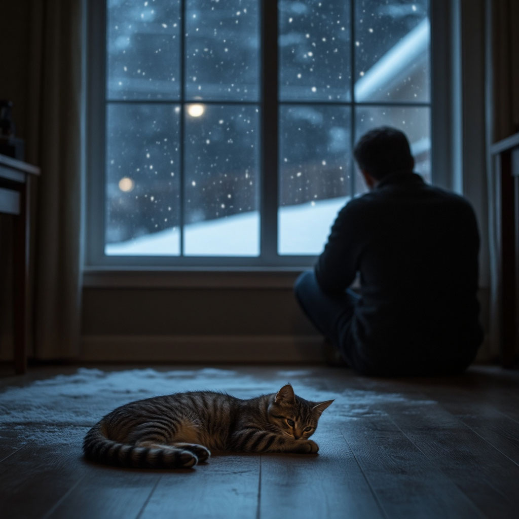 Он сидел на продавленном матрасе, уставившись в тёмное окно. Снег валил густыми хлопьями, укрывая серые панельки района. Это был его первый Новый год в пустоте. Без ёлки, без новогодних игрушек, без Деда Мороза, без подарков. Без семьи и его детей. Без друзей. Один. В пустой маленькой комнате. Пустота. Пусто было снаружи. И пустота заполнила внутри. За окном, в кромешной тьме между домами, иногда вспыхивали разноцветные зарницы фейерверков. Слышались приглушенные взрывы хлопушек и смех. Чужая радость била током. Он не зажигал свет. Темнота была его единственным одеялом — его союзником. В ней можно было раствориться. Год-оборотень. Год-предатель. Он унёс всё: брак, рухнувший под тяжестью молчания; детей, которые теперь засыпали в другом доме; бизнес, развалившийся, как карточный домик; друзей, растворившихся вместе с его статусом. Остался только этот остывающий каркас тела и комната, пахнущая пылью и отчаянием. Год назад всё было по-другому. Была семья. Был дом. Была работа. Было признание. Была надежда. А потом всё рухнуло. Долги навалились как снежный ком. Он остался ни с чем: ни семьи, ни дома, ни работы, ни надежды. Пустота. И тишина. Телефон молчал. Сердце тоже. Он встал, прошёлся по комнате. Голые стены, обшарпанный стол, одинокая лампочка под потолком. «Конец года, конец всему», — подумал он. Новый год. Чистый лист. Но как писать, если нет ни рук, ни карандаша? Он лёг, закрыл глаза, и пустота внутри убивающе зашептала. В какой-то момент этот шёпот разрезал тонкий, жалобный звук. Не фейерверк. Не смех. Писк. Он открыл глаза и прислушался. Звук повторился жалобно и настойчиво, где-то за окном. Он открыл его. Ледяной воздух ударил в лицо. На холодном бетонном выступе под карнизом, прижавшись к стене, сидел котёнок. Маленький, жалкий комочек мокрого меха, дрожащий от холода и страха. Глаза — два зелёных испуганных уголька — смотрели прямо на него. «И ты один?» — промелькнуло в его голове. Он нырнул в окно и протянул руку в колючий холод, но не смог дотянуться. Прыгнув в тапки, он выбежал на улицу. За каких-то три или четыре прыжка оказался под своим окном. Увидя в темноте зеленые точки, подхватил котёнка на руки. Ледяной комочек бился в его ладонях. Он посадил его на пол. Котёнок, ошеломлённый теплом, замер. Они смотрели друг на друга в темноте. Изможденный мужчина и дрожащее, полуживое существо. В пустой комнате не было еды. Но на банковской карте оставались деньги, бережно сохраненные на проезд. Он натянул куртку, вышел из комнаты. Спустился в круглосуточный магазин, купил бутылку самого дешёвого молока и пачку печенья. Девушка-кассир, улыбнувшись, сказала: «С наступающим». Он не обратил на это никакого внимания, лишь едва буркнув «угу». Пришлось включить свет. Щурясь от него, он разглядел перед собой дрожащее от холода маленькое тельце. Шерсть на нём слиплась от оттаявших сосулек, скрюченный от мороза хвост был поджат. И глаза — полные страха и непонимания того, что с ним происходит. Он налил молоко в блюдце и размочил в нём печенье. Котёнок, преодолев страх, стал торопливо лакать, захлёбываясь, урча и дрожа одновременно. Этот живой, благодарный звук разорвал тишину комнаты на тысячи осколков. Он наблюдал, как котёнок ест, как облизывается, как насытившись, неуверенно подошёл к нему и ткнулся мокрым носом в руку. И в этой точке соприкосновения что-то дрогнуло.