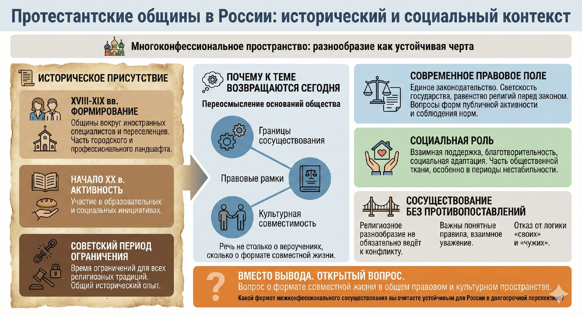 Россия традиционно формировалась как многоконфессиональное пространство. Это не всегда было простым процессом, но именно разнообразие религиозных традиций стало одной из устойчивых черт её исторического развития. Недавно на эту тему состоялся стрим на нашем Ютуб канале [здесь] Обсуждение религиозных меньшинств обычно возникает в периоды, когда общество переосмысливает собственные основания. Речь идёт не столько о вероучениях, сколько о границах сосуществования, правовых рамках и культурной совместимости. Протестантизм появился в России задолго до современных дискуссий.