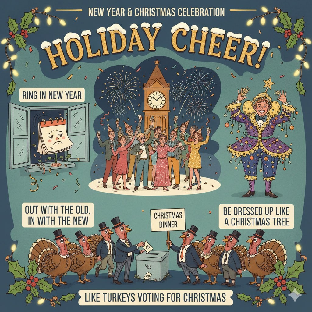 ? 🎉What is one "old" habit you want to get rid of, and what "new" habit do you want to start this year? Is it always good to replace the old with the new? In what situations should we keep "the old"? 💃Have you ever felt like you were dressed up like a Christmas tree at an event where everyone else was wearing casual clothes? How did you feel? 🎊In what situations is it actually good to be dressed up very brightly and extravagantly? 🎁Can you think of any examples from history, movies, or real life that look like turkeys voting for Christmas? Why do you think people sometimes make choices that are against their own interests?