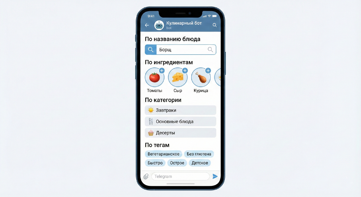 Кулинарный бот — это автоматизированный помощник в мессенджере Telegram, который берет на себя функции персонального шеф-консультанта. В отличие от традиционных рецептных сайтов, где нужно самостоятельно искать и фильтровать информацию, бот работает по принципу диалога: вы описываете ситуацию, а он предлагает готовые решения.