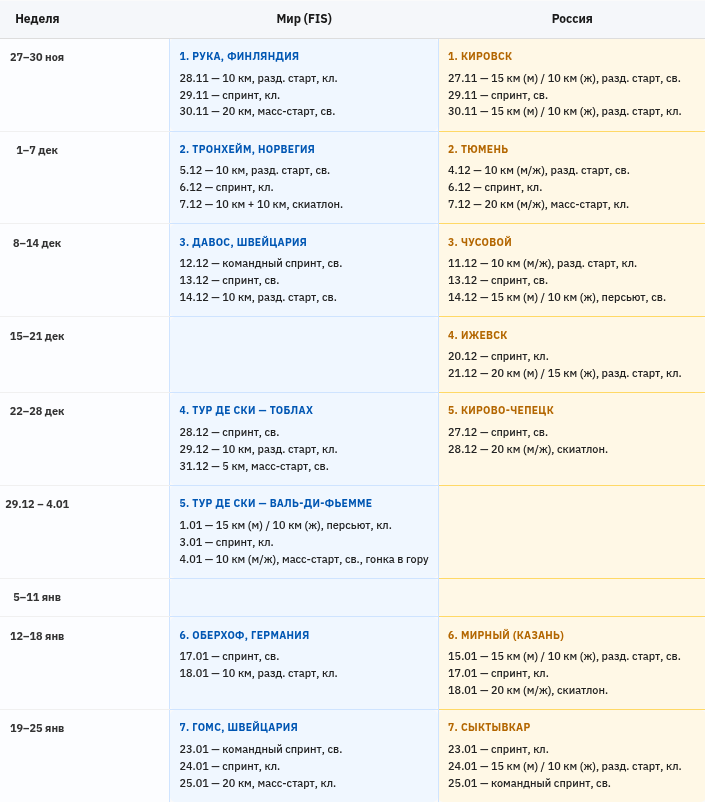 Календарь лыжного сезона 2025/26 — Россия и Мир