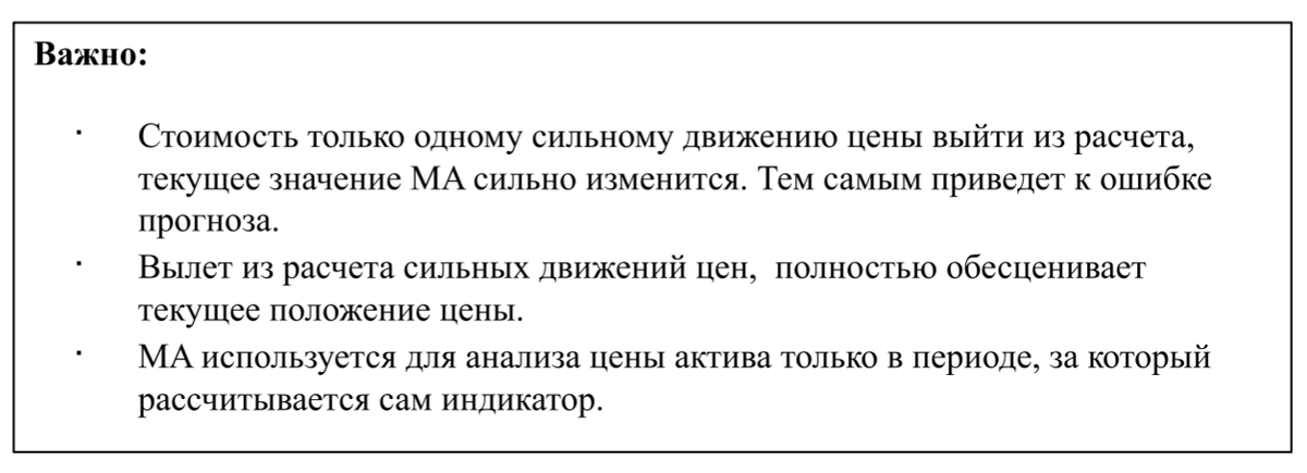 Часть 4.MA MA - он же moving average, он же скользящая средняя – усредненная цена актива за выбранный период. Определение правда, но не вся! Постулаты для применения MA в методе: Загиб скользящей средней - вверх или вниз - не имеет никакой прогностической функции, как и установившейся тренд в ней. 2. При каждом новом расчете MA убирается из расчета одна цена с хвоста расчета и добавляется новая в его голове. Поэтому нельзя считать текущее значение MA как текущая средняя акции. Средней она является только за тот период, который заложен в расчет индикатора. Пример: Вывод! Стоило выйти из расчета ценам сильного движения, даже при трех последних понижающихся цен, индикатор MA вырос с 133,46 до 138,08 или на 3,4 процента. 3. Стоимость актива всегда стремится сравняться с последними значениями, как и MA стремится сравняться с текущей ценой актива. Причин может быть масса, например: ценовой ряд в расчете скользящей средней начинает резонировать с текущими новыми ценами. Возвращаемся к прим
