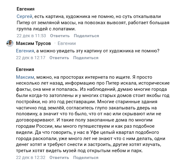Идея засыпанных городов среди альтернативщиков чрезвычайно популярна. У кого-то едса ли не весь мир засыпан, а некоторые обходятся единичными городами, например Санкт-Петербургом. Типичное поведение мракобесов: я сказала дичь, но доказывать её вам не собираюсь, сами ищите! Мы, конечно, попробовали, но по запросу "картина "люди откапывают Санкт-Петербург"" ничего найдено не было, кроме нейросетевого творчества, фотографий реальных раскопок и просто картин Санкт-Петербурга. Про то, почему глобальный потоп таких последствий оставить не мог, мы писали уже не раз и заострять на этом внимание не будем. Но, с другой стороны, наводнения реальные для северной столицы не были чем-то невероятным. Устранять последствия наводнений приходилось частенько. Особенно серьёзно стихия разбушевалась 7 ноября 1824 года. Когда вода по разным оценкам поднялась от 3,62 до 4,14 метров выше ординара футштока Адмиралтейства. Затоплению подвергся практически весь город кроме Литейной, Рождественской и Каретной ча