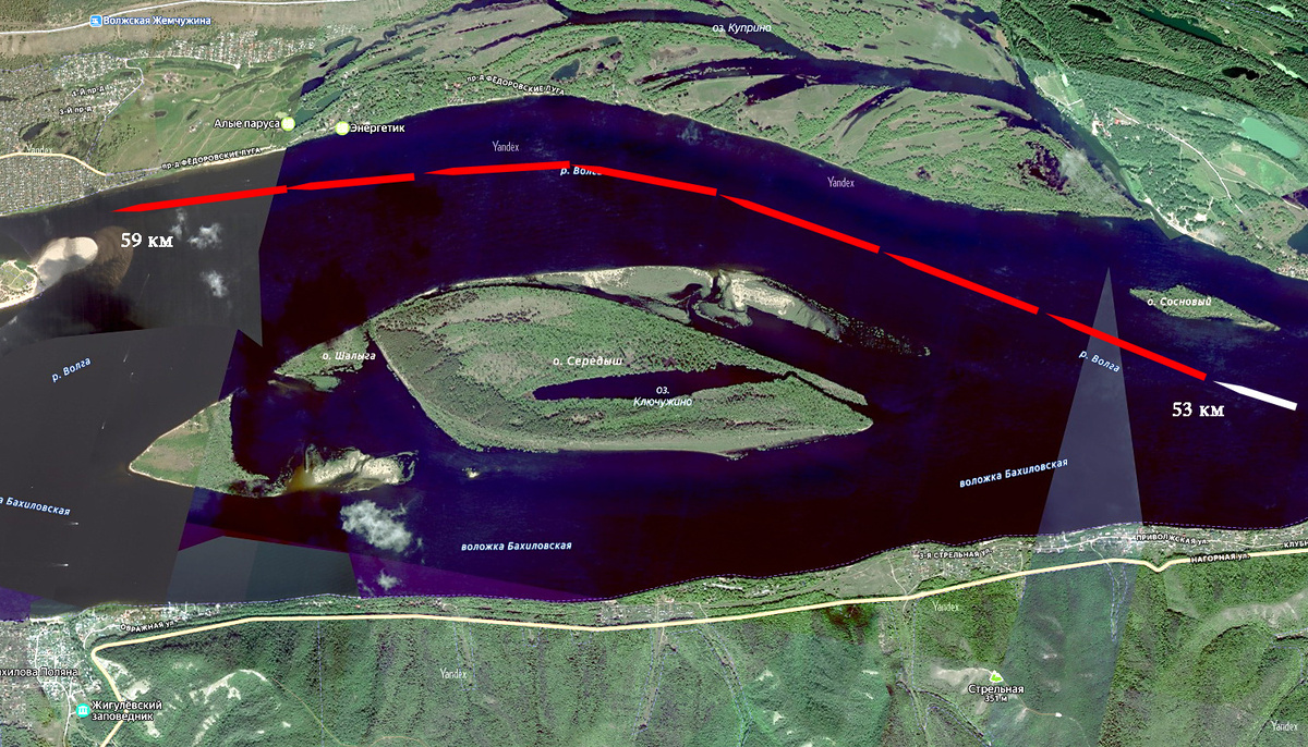 Уважаемые читатели, в предыдущей статье мы пытались рассмотреть на правом берегу Волги село Зольное в то время, как наш виртуальный теплоход удалялся от него в сторону левого берега, у которого расположены судоходные шлюзы Жигулёвского гидроузла. Взгляд с левого борта круизного теплохода на правый берег Волги: гора Стрельная и западная окраина села Зольного у подножия горы. Двигаясь в сторону судоходных шлюзов Жигулёвского гидроузла, проходим ухвостье (часть острова, расположенная ниже по течению, в нашем случае – восточная оконечность) острова Серёдыш. Взгляд назад, на пройденный путь. На снимке справа – остров Серёдыш на фоне правого берега. На правом берегу выше по течению от Зольного расположено село Бахилова Поляна, которое тоже входит в состав городского округа Жигулёвск. Перед входом в нижний подходной канал шлюза в какой-то момент с судового хода можно рассмотреть здание ГЭС и земляную плотину (её длина 2,8 километра). Но чаще сооружения закрыты или островом Серёдыш, или полуос