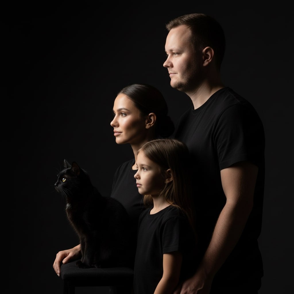 Промпт Nana Banana pro Семейный портрет поколений уровня «Топ» 🔥 Собрать весь табор, включая бабушку, детей и вредного попугая на одну фотосессию — квест, который обычно заканчивается дергающимся глазом. Но Nano Banana pro переварит хоть десять референсов за раз и выдаст обложку дорогого журнала, а не «мы просто встали у стенки». ⚡️ Совет по рефам: чтобы нейронка выдала 100% сходство, закидывай четкие портреты с хорошим освещением. Никаких фильтров, очков или рук, закрывающих лицо. Для питомцев — то же самое: мордочка должна быть видна отчетливо. 🛑 #Семейный_промпт Фотореалистичная фотография, на которой точно воспроизведены черты лиц с загруженных эталонных изображений. Необходимо сохранить 100 % сходства и идентичности лиц всех людей. Минималистичный семейный портрет [ семьи из трёх человек] и их [кошки] в [тёмной профессиональной студии]. Все изображены [в профиль сбоку], смотрят в одном направлении. На них [одинаковые простые чёрные хлопковые футболки]. Эффектное боковое освещен