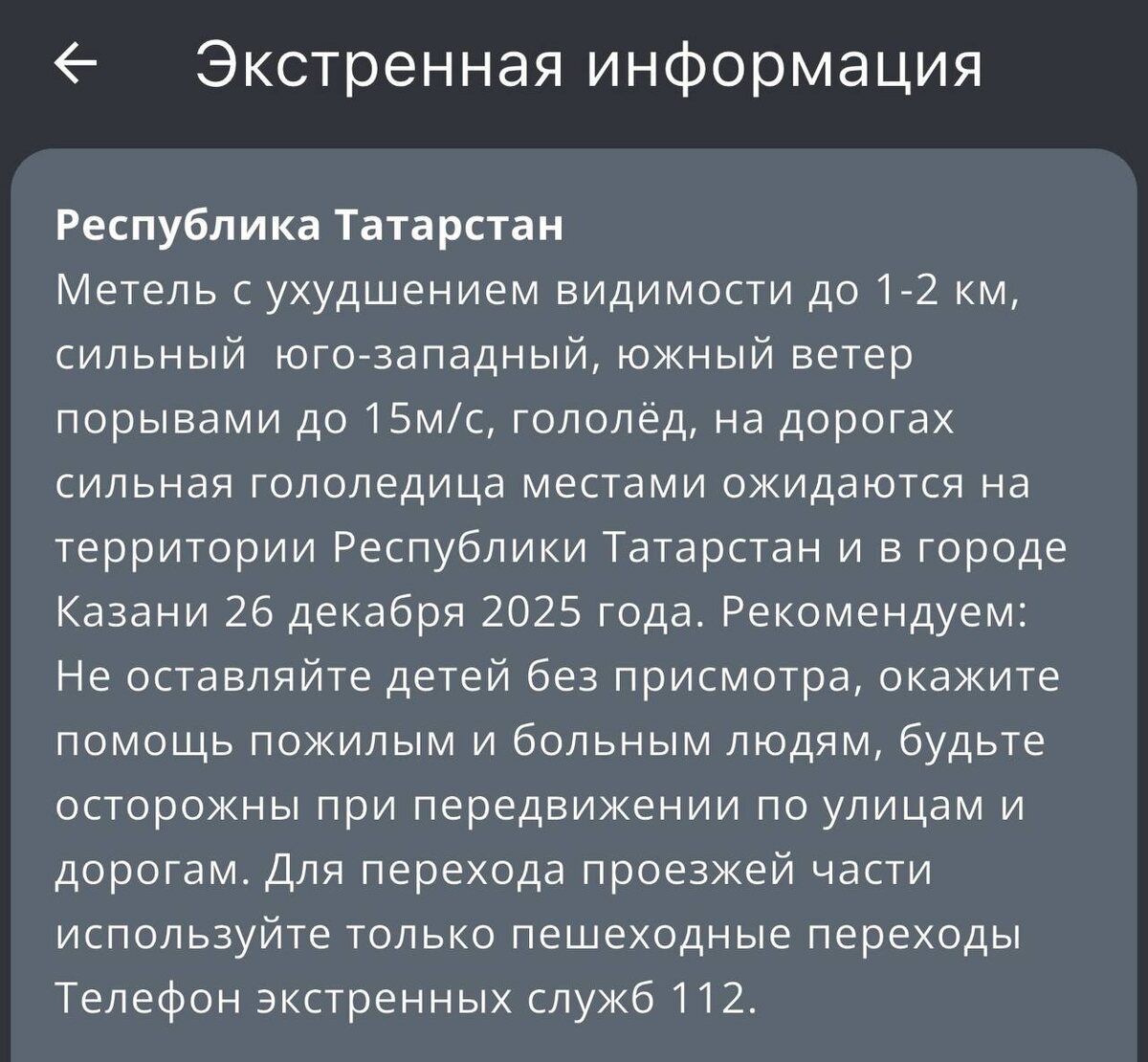 На территории республики ожидается метель с ухудшением видимости до 1-2 км, сильный юго-западный, южный ветер порывами до 15м/с, а на дорогах сильная гололедица. ⭐️ Татарстан News 📲 Татарстан News в MAX