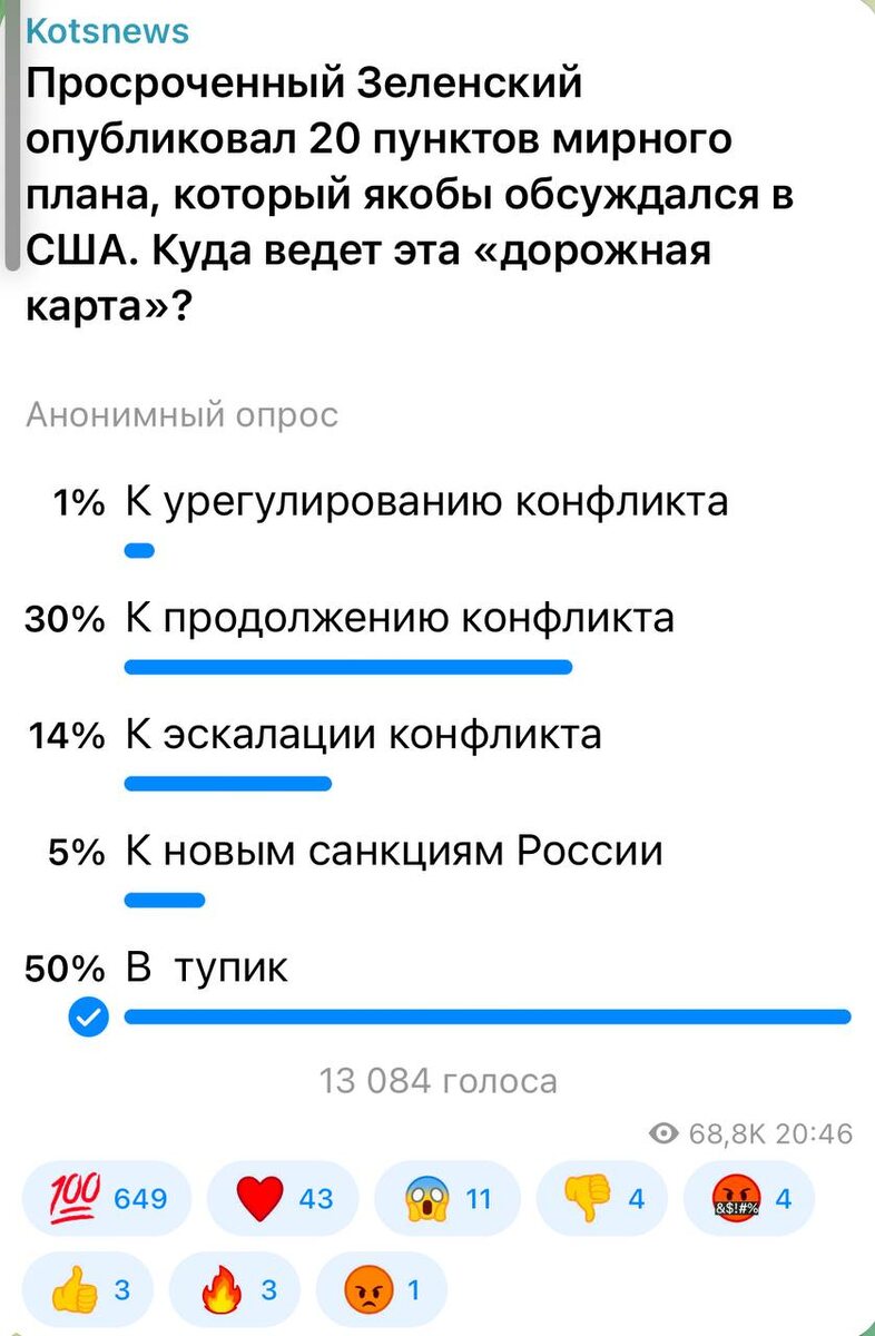 ⚡️⚡️⚡️ 50 процентов подписчиков считают, что переговоры зашли в тупик. Не хотят - и не надо. Заставим силой - по праву старшего брата.