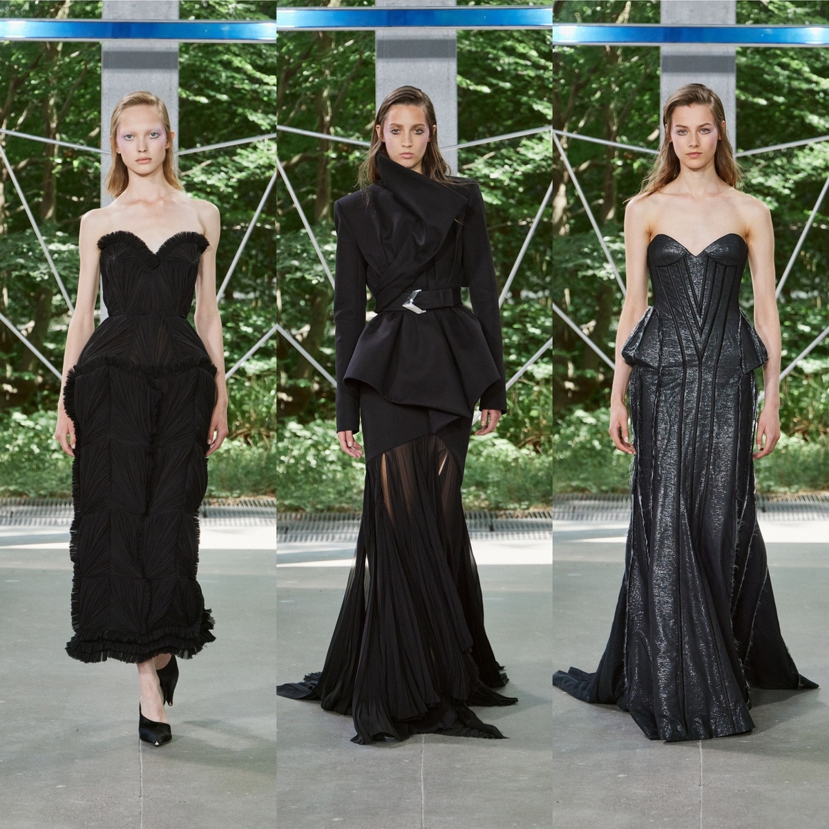Но коллекция — не только о точности. Она дышит, переливается, играет. Складки-гармошки повторяют ребристые поверхности ракушек, а мерцание, вдохновлённое биолюминесценцией, окутывает образы, словно блики подводного света. Здесь нет жёсткости: формы текут, словно прилив, то нарастают, то отступают, создавая ощущение живого движения. Ардакани не боится сложных силуэтов. Коническая юбка парит над телом, будто невесомая волна, а мини-накидка с пластинами обволакивает фигуру с почти научно-фантастической точностью.
