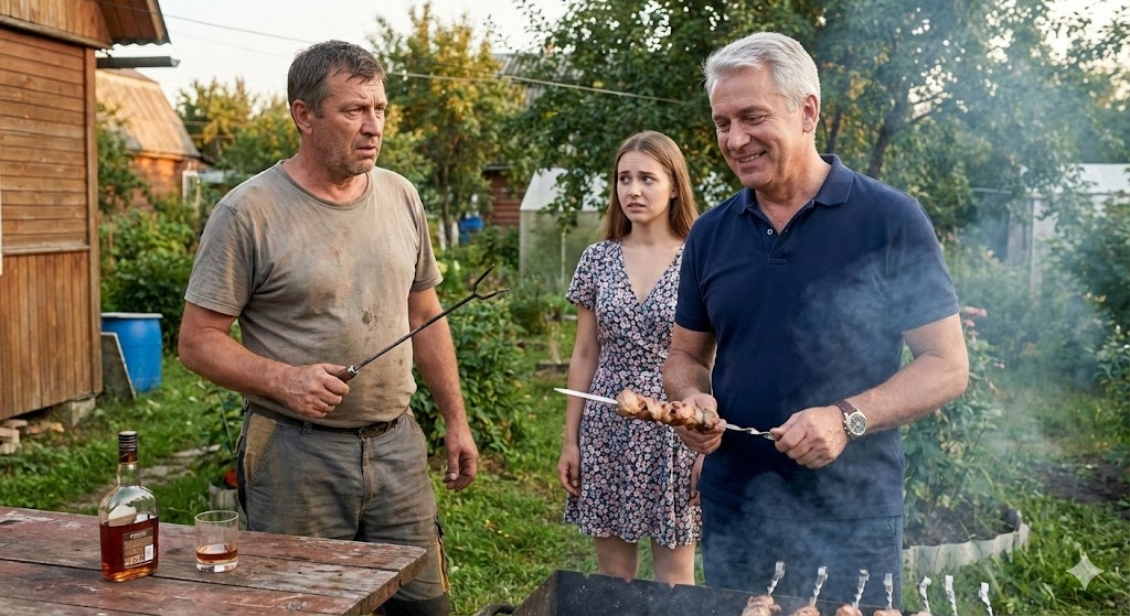 Виктор Петрович обернулся. В одной руке шампур, в другой — веер для углей. Широкая улыбка, предназначенная любимой дочери, начала расплываться по его лицу… и вдруг замерла.
