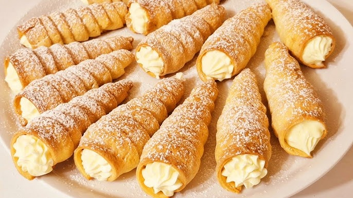 - Достаньте румяные трубочки, аккуратно снимите бумажные кульки. Наполните их воздушным белковым кремом. Посыпьте сахарной пудрой.