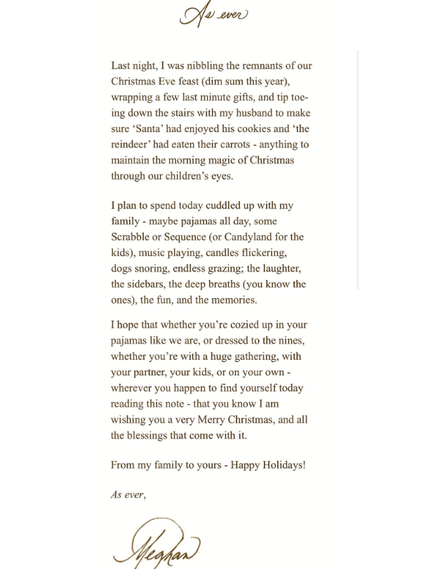 Меган Маркл, старательно избегающая весь декабрь слова "Рождество", двадцать пятого числа все-таки не выдержала. Имея два аккаунта в соцсетях - личный и своего так называемого бренда - она, тем не менее, свои мысли о праздниках решила опубликовать официально - на сайте As Ever, в информационном бюллетене. Там она приоткрыла завесу тайны над планами своей семьи на Рождество, рассказала о том, как она и Гарри поддерживают "утреннюю магию" Рождества для своих двоих детей. И что в канун Рождества они устроили себе "пир" из дим-самов, после чего уложили детей спать. *** Дим-сам - это традиционная китайская трапеза, состоящая из множества маленьких закусок, подаваемых с чаем, особенно популярная в Гонконге и южном Китае во время бранча или завтрака. Название переводится как "тронуть сердце", а блюда включают пельмени, булочки бао, рулеты из рисовой лапши и другие закуски с начинками из мяса, морепродуктов, овощей. Подаются в бамбуковых корзинках. *** Меган добавила, что планирует провести Ро