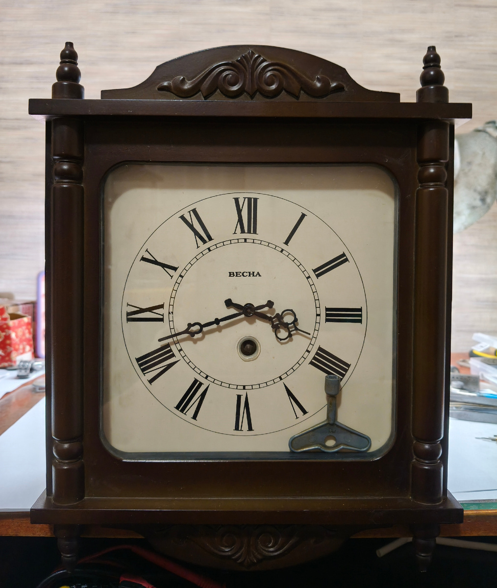 Доброго времени суток! Принесли в ремонт часы Весна настенные - не идут, лежали несколько лет в чулане. Часы в хорошем состоянии. Думаю сделали их в лихие 90-е годы. Стекло откидывается на петлях. Корпус деревянный. а вот передняя панель пластик. Сохранилась заводская наклейка. Открутил заднюю крышку. Снял стрелки и вынул механизм. Баланс целый. Нужна чистка. Видимо из за того часы лежали в сыром помещении появился зелёный налёт на колёсах. Первым делом решил разобраться с приставным ходом. Разбираю и отправляю все детали в мойку. Отмыл бензине, смазываю все цапфы. На балансе также есть небольшой налёт, постарался его отмыть. Приставной ход готов - теперь очередь механизма. Сразу мне не понравился барабан - сделан из непонятного металла. Трибы колёс забиты серым веществом с зубьев этого барабана. Буду его менять. Нашёл для замены прекрасный, проверенный временем, латунный барабан. Пружину чищу и смазываю. Механизм собрал. Смазал все цапфы. Установил приставной ход - идут отлично. Попр