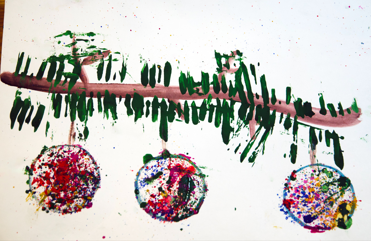 А сеучас будем устраивать обещанные каляки-маляки. Выбираем место под веткой, где хотим изобразить шарик, и кладем туда вырезанный нами шаблон. Желательно закрыть весь рисунок, чтобы не запачкать лишнее. Набираем кисточкой краску, подносим к отверстию в шаблоне и стучим по ней карандашом. Брызги краски летят на бумагу, а также на ребёнка, стол и всё вокруг😆. Юный художник в восторге, можно законно свинячить, а мама сидит и думает, зачем в это ввязалась😂.