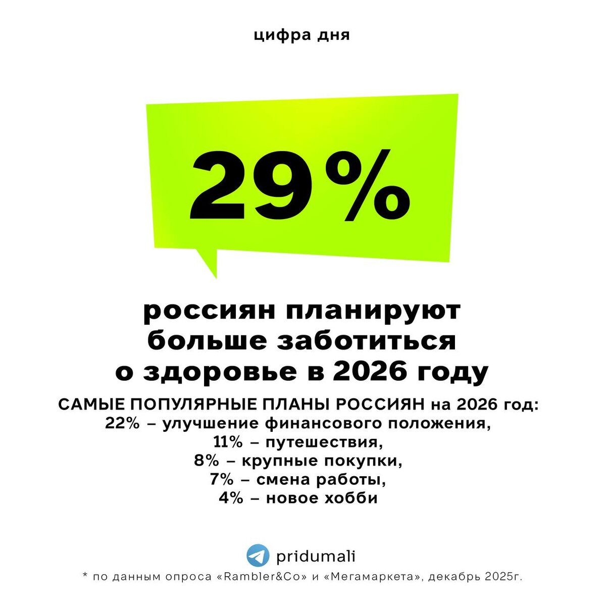 В рубрике «Цифра дня» данные опроса RAMBLER&CO и МЕГАМАРКЕТА — 29% россиян планируют больше заботиться о здоровье в 2026 году. Напомню сразу данные прошлого года. В конце 2024 года 49% россиян хотели начать вести здоровый образ жизни в 2025 году. Формулировка, правда, другая, но вектор сохраняется. Сразу после здоровья, в приоритете: 🟢улучшение финансового положения (22%) 🟢путешествия (11%) 🟢крупные покупки (8%) 🟢смена работы (7%) 🟢новое хобби (4%) 👉подписаться на @pridumali #исследования