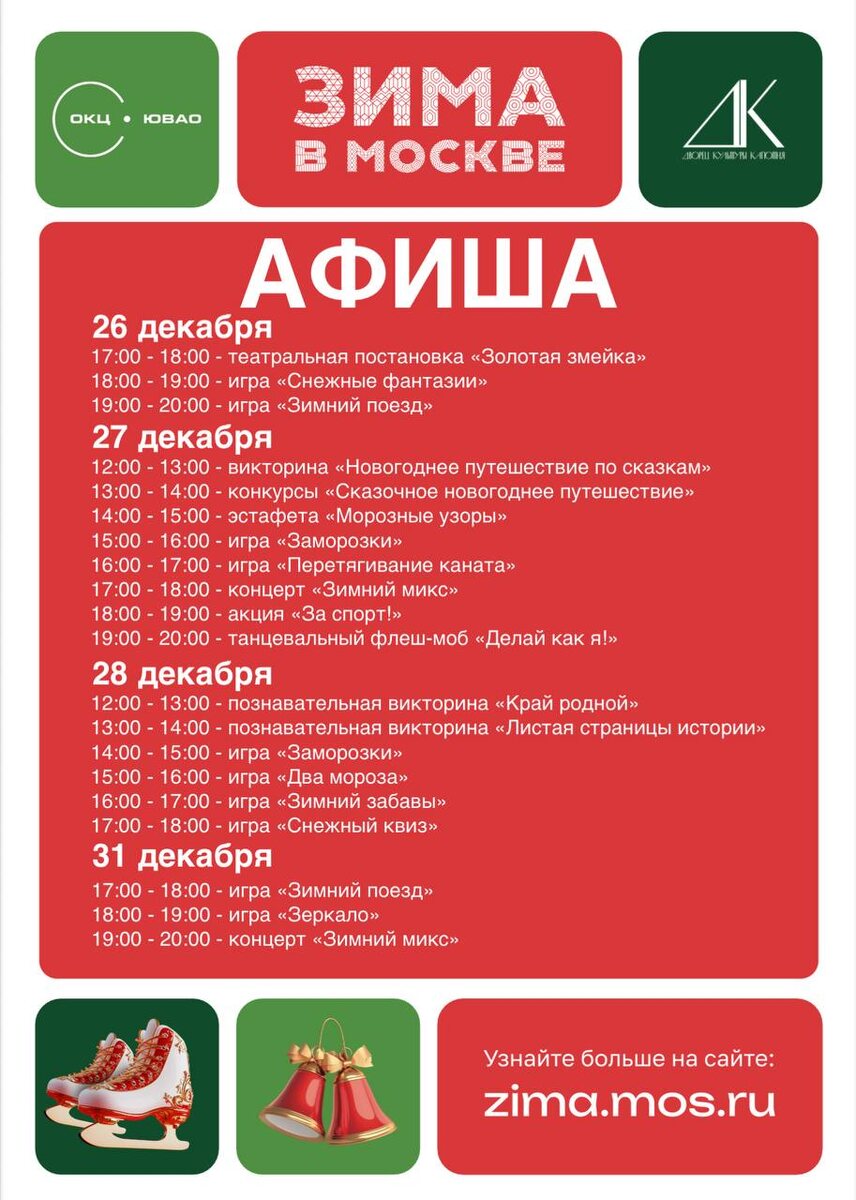 ! С радостью сообщаем вам, что в рамках грандиозного проекта Мэра Москвы Сергея Семеновича Собянина "Зима в Москве" на нашем катке с 26 по 31 декабря вас ждут незабываемые дни, наполненные весельем и активностями. ❄️❄️❄️ Не переживайте, если у вас нет своих коньков – на нашем катке работает удобный прокат, где вы сможете подобрать пару по размеру.☺️ Развлечения не ограничатся только ледовой площадкой! Игры и активности будут проходить и на прилегающей территории, так что каждый найдет себе занятие по душе. Приходите всей семьей, с друзьями, и окунитесь в атмосферу настоящего зимнего праздника!❄️❄️❄️ #ЗИМАВМОСКВЕ #МОСКВА #КАПОТНЯ #КЦКАПОТНЯ #ОКЦЮВАО