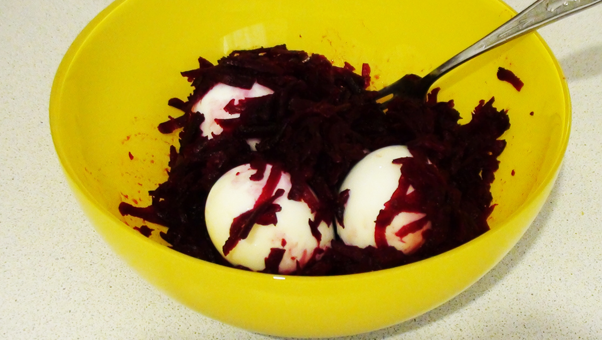 Вкусная, простая, красивая закуска которая украсит стол на любой праздник! НАДО: Свеклу и яйца сварить, остудить, почистить. Свеклу натереть на крупной тёрке и закопать в неё яйца. Держать минут 20-25. Когда яйца окрасились в желаемый цвет достаём и обдаём водой. Разрезаем на половинки. Желток разминаем вилкой, выдавливаем в него чеснок и заправляем майонезом. Наполняем начинкой половинки белка и украшаем зеленью. Наполнять можно ложкой, но из кондитерской насадки выглядит красивее. Вот и всё! Просто и красиво!)
