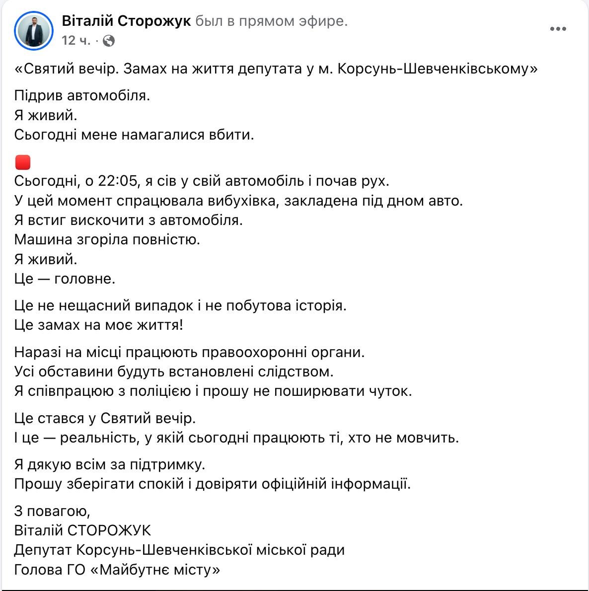 Депутат Корсунь-Шевченковского горсовета Виталий Сторожук заявил, что его авто взорвали, когда он начал движение, но он успел выпрыгнуть. Машина сгорела. Похоже на пиар Подпишись на Телеграм Александр Семченко В этом посте есть большое видео, которое не загрузилось в Дзен. Откройте оригинал поста в телеграме, чтобы его посмотреть
