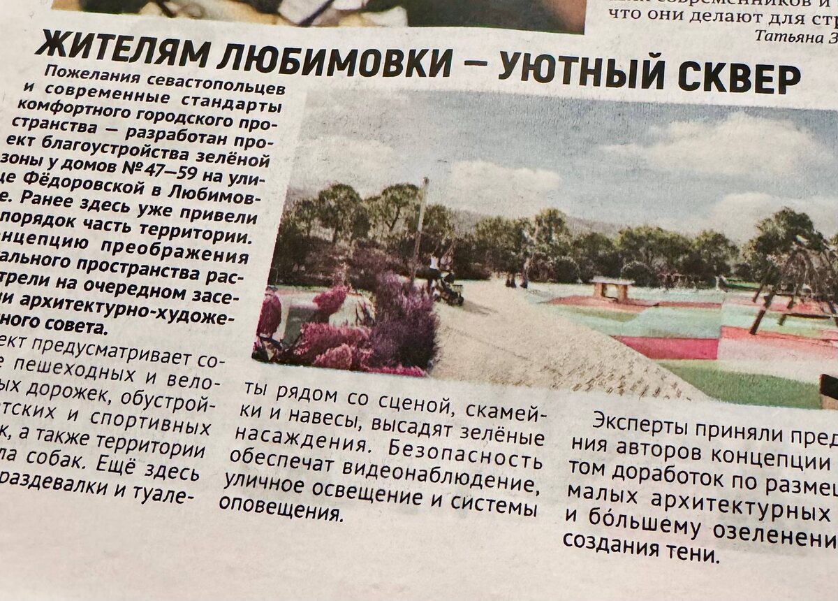 В новом выпуске газеты «Слава Севастополя» мы рассказали о концепции преображения сквера, которую обсудили на очередном заседании архитектурно-художественного совета. 🗞️ «Пожелания севастопольцев и современные стандарты комфортного городского пространства легли в основу проекта благоустройства зелёной зоны у домов №47-59 на улице Фёдоровской в Любимовке. Ранее здесь уже была приведена в порядок часть территории», — написали в газете. В сквере появятся пешеходные и велосипедные дорожки, специалисты обустроят детские и спортивные площадки, территории для выгула собак, раздевалки, туалеты, скамейки и навесы. 📰 Слава Севастополя