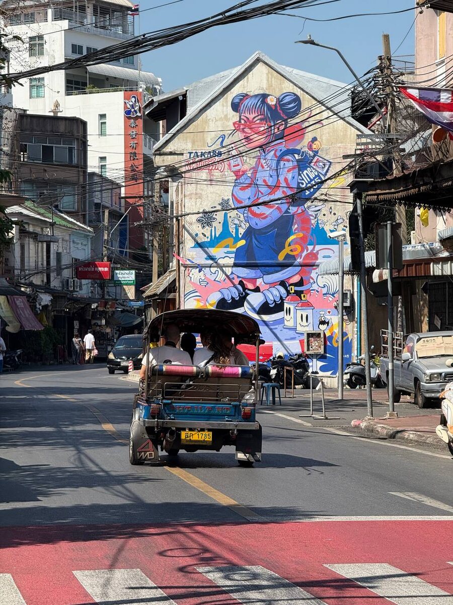 Если хочется увидеть Бангкок не шумным и туристическим, а живым и атмосферным — очень советую этот маршрут. Он про старые районы, узкие улочки, граффити, локальные кафе и неспешную прогулку🍵 📍 Старт — станция метро Wat Mangkon (MRT) Сразу выходите к Чайнатауну (Yaowarat Road) — это одно из самых колоритных мест города. Днём здесь интересно рассматривать лавки и архитектуру, а вечером улица превращается в яркий, шумный и очень фотогеничный район с неоновыми вывесками и уличной едой. Я советую увидеть её дважды — днём и поздно вечером 🍜 Дальше маршрут уходит в более спокойную сторону: 📍 Song Wat Road — старинная торговая улица вдоль реки с красивыми фасадами, складами, небольшими галереями и кафешками. Здесь уже гораздо тише, и город ощущается совсем иначе. 📍 Talat Noi — мой любимый участок маршрута. Это лабиринт невероятных улочек 🟠стильные кофейни 🟠винтажные магазины 🟠лавками с посудой 🟠граффити и уличным искусством Район очень фотогеничный и при этом максимально локальный — б