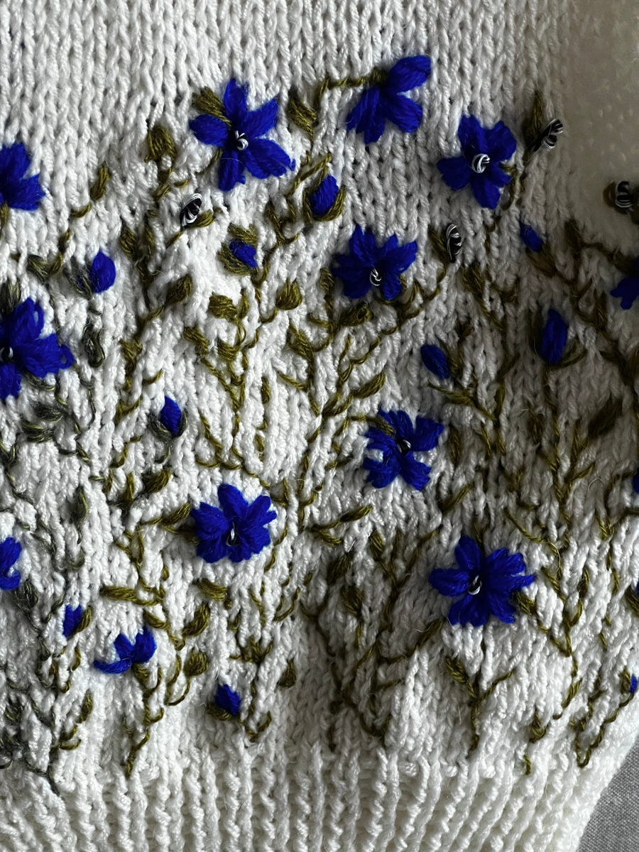 Всем привет и еще немного "синих приветиков" ! На сегодня у меня показ вязаной готовой работы в виде кофточки на пуговицах с вышивкой синих цветов в свободно - ходовой стежке. Такая манера вышивки всегда была в моем вкусе, и не раз я использовала ее в своих работах . Мне нравится в ней то, что здесь есть свобода самовыражения , нет необходимости следовать классической схеме вышивания гладью или кропотливой подборки цвето - нитей в вышивке крестиком с привязкой к определенной схеме. Рисунок на моих вышивках складывается сам собой и в этом его привлекательность и неповторимость. Что касается синего цвета - это одна из любимейших красок всех вышивальщиц - рукодельниц мира. Недаром природа наделила этой краской птиц, минералы, ягоды и разные цветочные растения. Их красивые соцветия можно увидеть как на лугах среди разнотравья, сельскохозяйственных полях со льном, "синьками"-васильками среди злаковых, и на приусадебных участках многих цветоводов. Синий цвет в природе