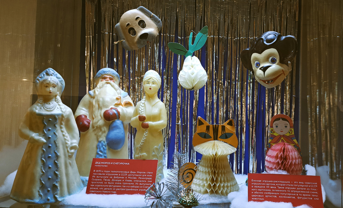 До 18 января 2026 в музее открыта выставка «Старый Новый год». Представлено более 200-та экспонатов из частной коллекции Ольги Рябцевой. Выставка небольшая и находится на 5 этаже дополнительного здания (которое с башенкой, вход в него находится слева от основного). Найти ее можно в двух залах среди растений оранжереи. Украшено помещение цепочкой из разноцветных бумажных колечек, которые, я думаю, многие делали в детстве на школьных уроках. Установлено несколько стендов, дополненные настенными плакатами и елкой в ретро-стиле. На выставке присутствуют игрушки популярных серий: космос, дары природы, часы. Которые отображают изменение в идеологической политике и культурной жизни страны.