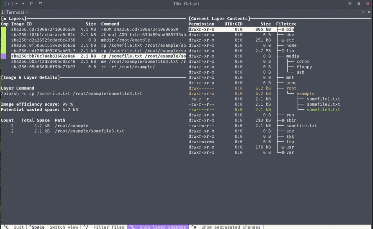 Текстовый интерфейс dive позволяет визуально исследовать каждый слой образа и просматривать файловую систему контейнера на каждом этапе его сборки. Репозиторий: https://github.com/wagoodman/dive Экран разделён на две основные части: слева — список слоёв, справа — дерево файлов выбранного слоя. Программа подсвечивает изменения при переключении между слоями — показывает, какие файлы были добавлены, изменены или удалены на конкретном шаге, и автоматически оценивает эффективность образа, показывая метрику wasted space. Wasted space возникает, например, когда файлы копируются в одном слое и удаляются в другом: файлы остаются в истории образа и занимают место, хотя в финальной файловой системе их нет.