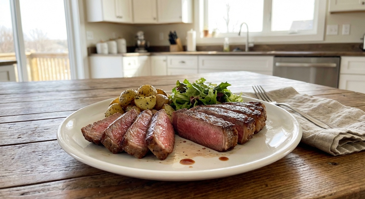 - Medium rare (сочно, розово) — примерно 3–4 минуты с каждой стороны на сильном огне для стейка 2,5–3 см, плюс отдых 5–7 минут.