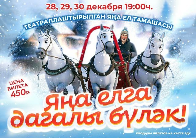Бураево! Приглашаем вас на волшебное новогоднее театрализованное представление "Яңа елга дагалы бүләк" Вас ждут: Захватывающий сюжет с любимыми героями! Яркие костюмы и декорации! Веселые песни и танцы! Незабываемое новогоднее настроение! Когда: 28, 29 и 30 декабря в 19:00 Где: МАУ "Бураевский РДК им. Р. Галиевой" Цена: 450 рублей Не упустите возможность окунуться в сказочную атмосферу Нового года! Билеты можно приобрести на кассе РДК. Справки по телефону: 8(34756)2-12-66