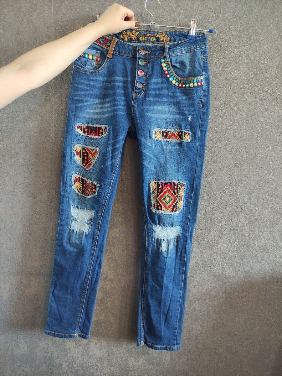 Богемные образы. ---------------------- Всем привет! Меня зовут Ирина, добро пожаловать на мой канал! Сегодня снова статья об испанской страсти, средиземноморском солнце и безудержной фантазии. Да, да – вы правильно догадались! Наш любимый Desigual!!! Я все также безудержно ищу их уникальную винтажную одежду и сумки в секонд-хенде для моих подписчиков в телеграм канале. Их стиль – дерзкая, гипнотизирующая мозаика. Здесь лоскутный пэчворк встречается с фактурной вышивкой, а бунтарские граффити смело переплетаются с романтичными цветочными акварелями. Асимметрия, контрасты и невероятная игра текстур создают уникальный визуальный язык. ---------------------- Джинсы "Desigual" Яркие джинсы с характером! Насыщенный синий деним с легкими потертостями и эффектом «варки» создаёт красивый контраст с этническими вставками. На коленях и бедрах – рваные детали, под которыми выглядывает плотная ткань с орнаментом в красно‑горчичных и черных тонах, словно кусочки ковра ручной работы. Линия карманов
