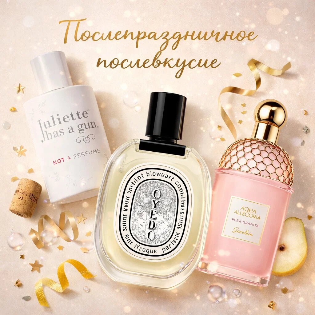 День после праздника - особое состояние. Шампанское уже переехало в разряд приятных воспоминаний, в голове всплывают фрагменты вчерашнего вечера, а главный план на сегодня - совершить два подвига: встать и выглядеть относительно свежо 😄 В такие дни рука редко тянется к сложным, насыщенным композициям. Хочется не «шлейф на весь подъезд», а лёгкий, аккуратный аромат, который поддержит состояние и мягко соберёт образ. Без тяжёлых спецэффектов, без парфюмерного перфоманса - только комфорт и немного красоты. Разберём три послепраздничных настроения и три аромата, которые с ними отлично справляются. Это аромат для тех самых дней, когда хочется нажать внутреннюю кнопку «освежить». Pera Granita ощущается как грушевый сорбет в стеклянной чашке: прохладный, сочный, чуть шипучий. С первых секунд чувствуется яркое фруктово-цитрусовое звучание: груша, играющая где-то между хрустящей и спелой, и лёгкая кислинка цитрусов. Дальше появляется деликатная цветочная мягкость, а в шлейфе аккуратная чистота