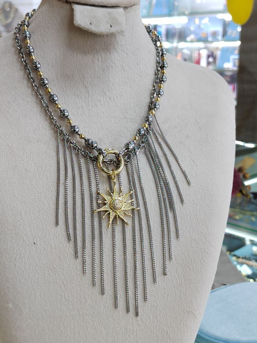 Все самое модное в этом сезоне ожерелье. Каскад цепочек, солнышко, шарики из металла и гематита