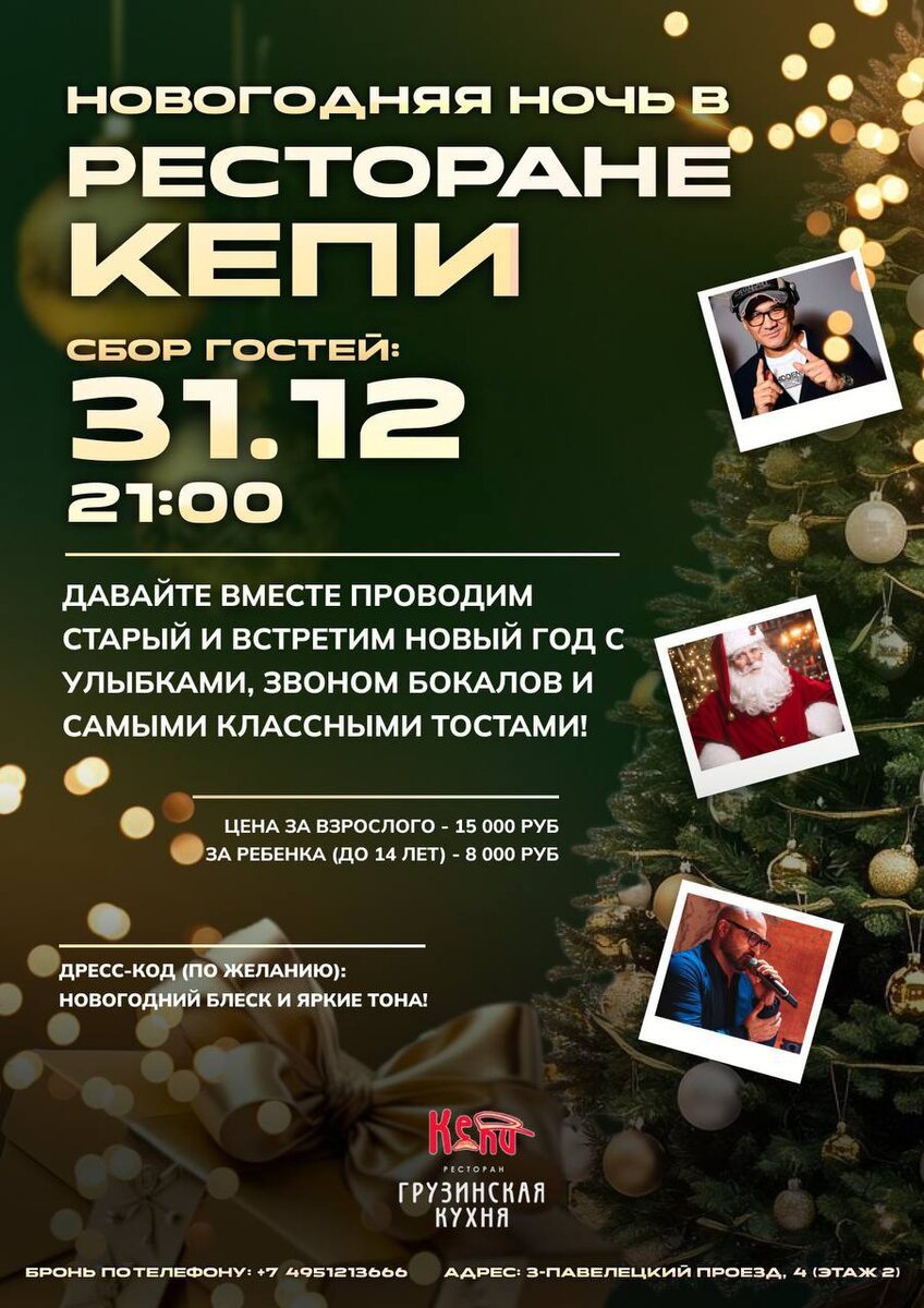 ! Дорогие гости! 🌟 Приглашаем вас встретить Новый год, год Огненной Лошади, в ресторане Кепи на Павелецкой. Вас ждёт увлекательная программа с ведущим и диджеем, всеми любимые песни от участника шоу голос - Жана Осяна, сюрпризы от Деда Мороза и Снегурочки, очень вкусная еда, напитки, танцы до утра и фейерверки в 00:00! Чем угощаем (входит в стоимость): ✨Холодные закуски; ✨Салаты; ✨Выпечка; ✨Два вида горячих блюд; ✨Десерты на выбор; ✨Безалкогольные напитки без ограничений; ✨Алкогольные напитки - вино, водка, игристое, виски, коньяк - ограниченное количество, возможность принести с собой. ❗️Сбор гостей: 31 декабря 2025 года в 21:00 Расход гостей: в 4:00 :) 📍Адрес: 3-Павелецкий проезд, 4 (этаж 2) 💃🏻 Дресс-код (по желанию): Новогодний блеск и Яркие тона! 📞 Бронь по телефону: +74951213666 💰 Цена: за взрослого-15 000₽ за ребенка (до 14 лет)-8 000₽ 🎄Давайте вместе создадим незабываемый праздник https://t.me/kepirest