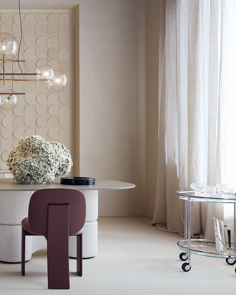 Бренду удалось создать место, где дизайн превращается в эмоциональный опыт, способный восстановить глубокое спокойствие, которое мы ищем сейчас больше, чем когда-либо в своих домах. Входя в пространство, чувствуешь себя словно в мягких объятиях: каждая деталь тщательно продумана, чтобы создать ощущение тепла и настоящего дома. Нейтральные тона сдержаны, но полны нюансов, в то время как дерево, металлы, стекло и ткани гармонично сочетаются в дизайне, совмещающем чистоту форм и качество поверхностей. Пространство, которое не навязывает, но мягко сопровождает; которое не выставляет напоказ, а тонко подсказывает, приглашая к паузе и диалогу. В основе идеи лежит баланс между материалом и формой: прочность камня контрастирует с визуальной легкостью структуры, создавая игру противоположностей, усиливающую как функцию, так и красоту. Диван Stami Sofa Plus, журнальные столики Selce, кресло H2O Lounge от Studiopepe; журнальный столик Monete от Massimo Castagna, подвесная лампа Tratto от Dra