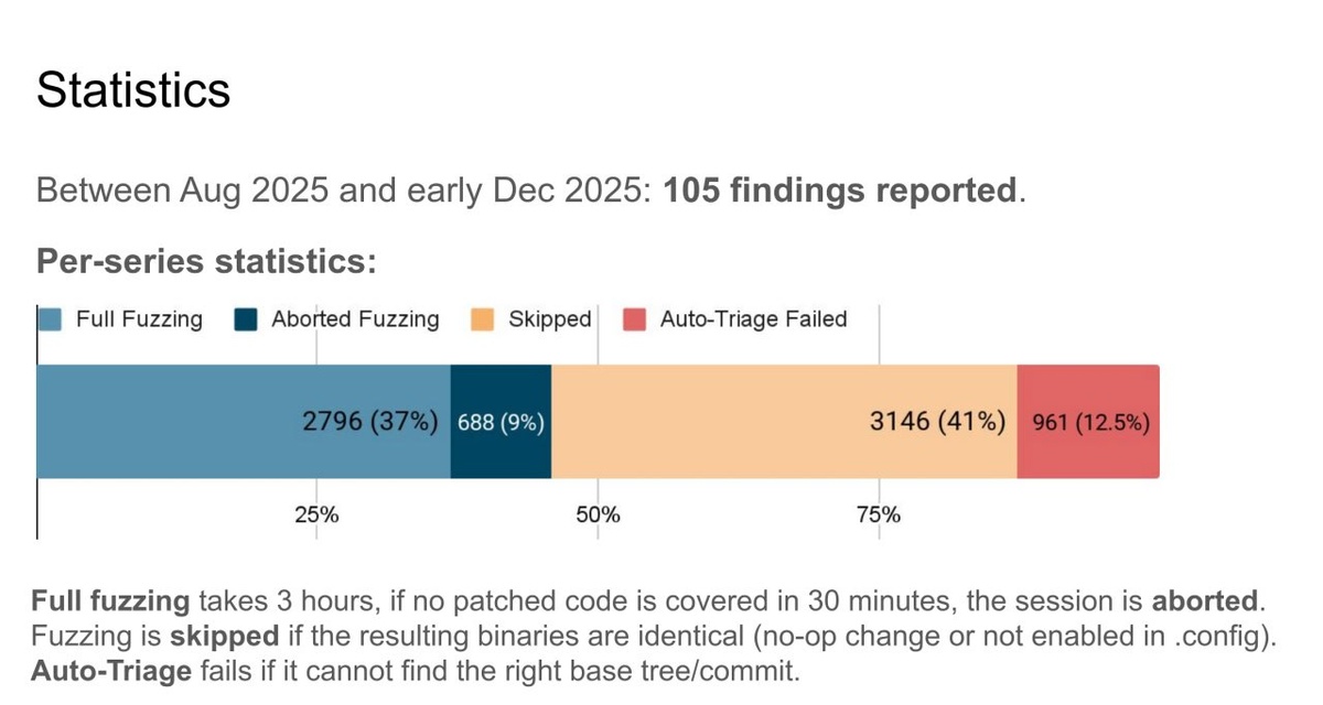 С августа 2025 года syzcaller делает шаг влево: серии патчей в рассылке по некоторым подсистемам ядра подвергаются фокусному фаззингу ещё на этапе ревью. Найденные креши, которые воспроизводятся без патчей, не репортятся. Фаззингу подвергаются только функции, у которых поменялся объектный код, и файлы, которые затронули патчи. С августа по декабрь было найдено 105 крешей. https://ci.syzbot.org/stats Доклад Александра Ногих с LPC: https://lpc.events/event/19/contributions/2195/