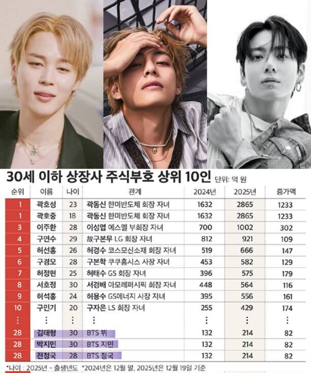 Согласно данным CEO Score, каждый из них владеет акциями примерно на 21,4 миллиардов корейских вон и был включён в список топ-100 крупнейших акционеров среди лиц до 30 лет в публичных компаниях. #JIMIN #V #JK @kumihobts