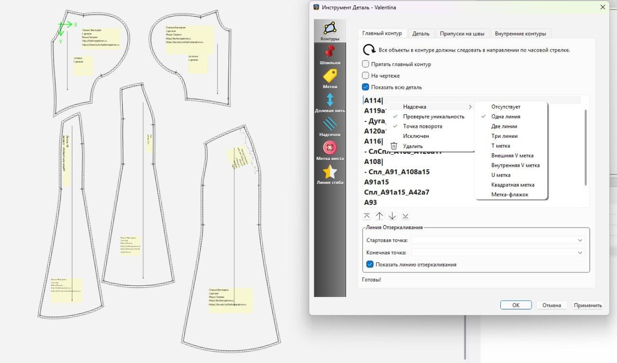 Целое утро потратила на это. Что надо иметь ввиду: ✅ Если не будете создавать припуски на швы, автоматически надсечки установить не сможете, надо их рисовать вручную.. Я имею ввиду на чертеже, а потом переносить их как внутренний контур. ✅ Если метка- надсечка, это точка посередине кривой, необходимо установить её в списке " главный контур", ПЕРЕД кривой, иначе кривая не будет отражаться правильно. ✅ Если кривая очень похожа на прямую, то проверьте не исказила ли ее эта надсечка, т.к. если она это сделала, вы просто этого не заметите. Для этого перейдите в " Чертеж" и изогните сильно кривую в какую - нибудь сторону, вернитесь в " Детали" и проверьте изменилась ли она там, если нет кривая, отобразилась как прямая. Поменяйте положение точки- метки вверх или вниз в разделе " Главный контур", и примените проверяя как ведёт себя линия детали. Когда вы удостоверились что кривая соответствует вашему чертежу, восстановите его.