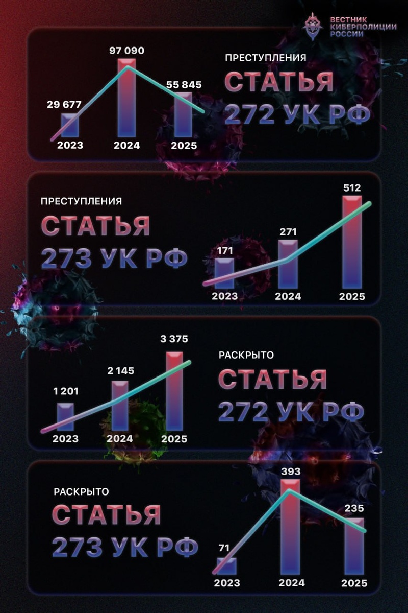 📈В 2024 году количество преступлений с использованием вредоносного программного обеспечения выросло более чем в 3 раза по сравнению с 2023 годом (+227%). Это связано с массовым распространением вредоносных приложений под видом сервисов, обновлений, «полезных» утилит и файлов для удалённого доступа, а также с активным использованием социальной инженерии. 📉В 2025 году фиксируется снижение числа таких преступлений примерно на 42% по отношению к пиковым значениям 2024 года. 📈По преступлениям, связанным с получением неправомерного доступа к компьютерной информации (ст. 272 УК РФ), количество расследованных дел увеличилось с 1,2 тыс. в 2023 году до 3,4 тыс. в 2025 году (рост почти на 180%). 📈По преступлениям, связанным с созданием и распространением ВПО (ст. 273 УК РФ), рост ещё более выраженный — с 71 расследованного преступления в 2023 году до 235 в 2025 году (более чем в три раза). 🫡Подписаться на Киберполицию России 📲 Max I 📱 ВK I 📱 ОK 🇷🇺 Чат-бот Киберполиции России 🫡