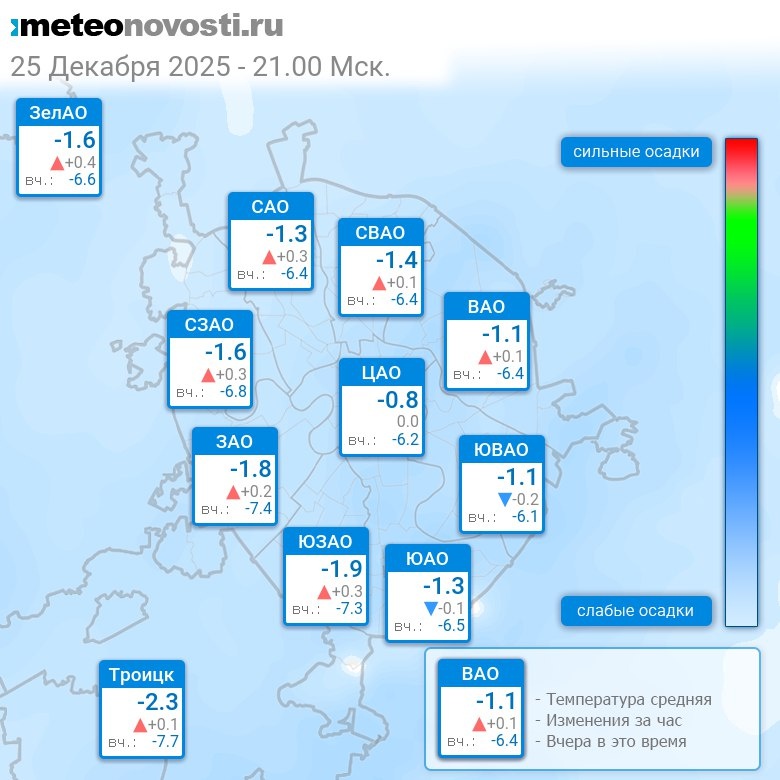В 21:00 в Москве было от -2.7°C до -0.5°C, средняя температура -1.4°C #погода #Москва #зима #температура #25декабря #четверг