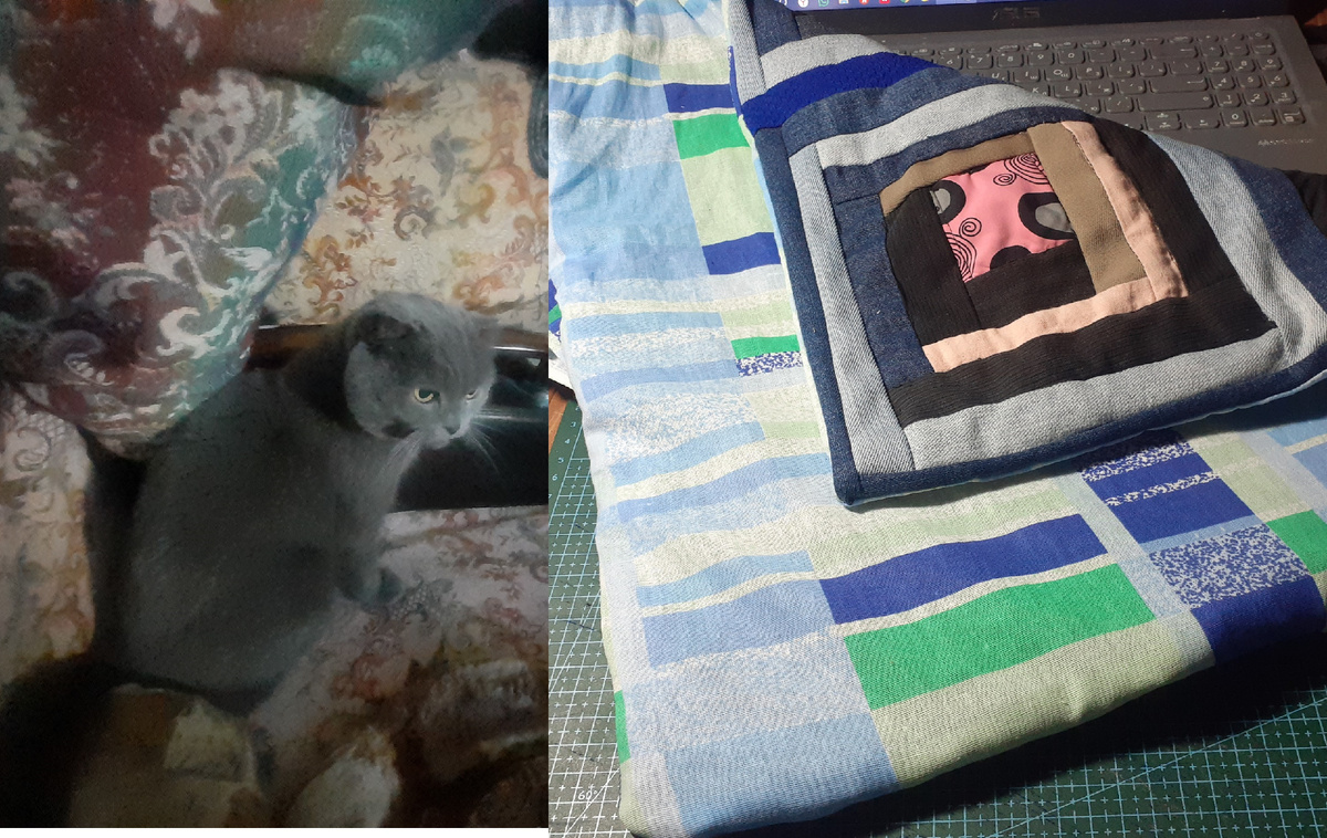 А котейка ещё не знает, какой её ждёт сюрприз! Всем, здравствуйте! И снова я с вами. Вот всё никак не получалось с настроением сесть и закончить эту работу. Но вечером в среду твёрдо для себя решила хотя бы начать продвижение в четверг. Уже в постели в мыслях перебрала, что можно использовать в качестве подкладки, было три варианта из хлопковых тканей. Хлопковые, потому что я уже "утяжелила " коврик плотной прокладкой между лицевой частью и задней. А это изнанка с прокладкой. Кстати прокладку немного вручную как бы простегала( чёрные полоски ниток, но на лицевой часть они спрятались в швах полосок) Вот это плотная прокладка, которую закроет подкладка Это с целью удобства для кошки, чтобы коврик надёжно держался на месте. Утром выбрала кусок из нового простынного полотна с голубым оттенком. Вот так рядом выглядит лицевая часть с изнанкой Края изделия получились толстоваты, поэтому края будет сложно обрабатывать бейкой, решила использовать простейший вариант - лицевую часть и подкл